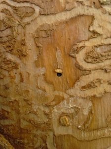 Galeries et trou de sortie de l’agrile du frêne